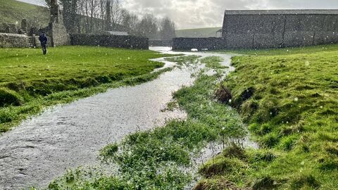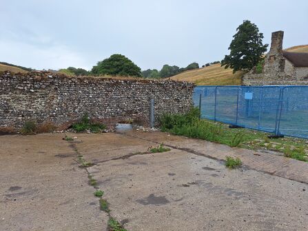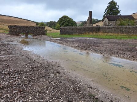 One of the areas where we have already made some significant progress is at the former farmyard. In the past, the stream here was controlled by a metal sluice gate before passing through an archway underneath an old flint wall and then being confined into a culvert pipe buried beneath the concrete yard. Whilst the flint wall must remain as it is a historic feature, the metal sluice gate, culvert pipe, and concrete yard have now been removed, freeing the stream from its concrete confines. Where the concrete yard once was, we will be sowing wildflower seeds, so in the future there will be a species-rich meadow leading down to the stream. Further work to reconnect the Little Piddle to its floodplain is planned for this coming winter with the installation of several leaky dams.