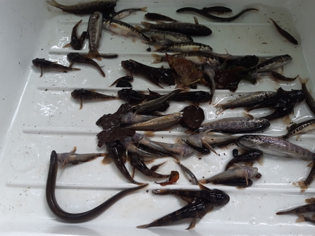 In partnership with the National Trust and funded by the Environment Agency, an electro-fishing survey has recently been conducted on the Corfe River by the Global Environmental Solutions team from Bournemouth University to update our knowledge and understanding of which fish species are in the river. At specific locations along the watercourse, an electric current was used to stun and capture the fish inhabiting the river. Working swiftly and calmly, the experts identified and measured the fish before safely returning them to the river unharmed. This surveying technique enables us to gather valuable data which provides a benchmark for identifying changes in the fish population and informing future river management decisions. The survey revealed five different species of fish of varying size and at different stages of the life cycle: brown trout, European eel, brook lamprey, minnow and bullhead.
