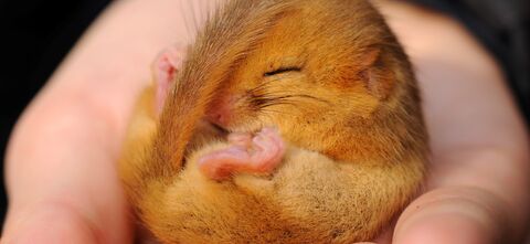 Steve Masters / Hazel dormouse in the hand as part of a dormouse survey at Powerstock Common