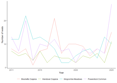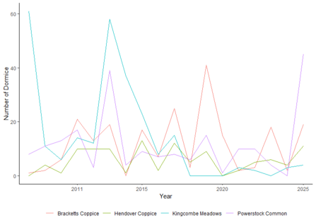 So, 2025 was the year of the late dormouse for many of our nature reserves. Where we have consistently been monitoring them, through the National Dormouse Monitoring Programme (NDMP), last year delivered some of the highest numbers of nests and dormice for a number of years, shown in the graphs below. This was especially concentrated toward the end of the season, with highest numbers recorded in October and November, including a large number of young dormice.