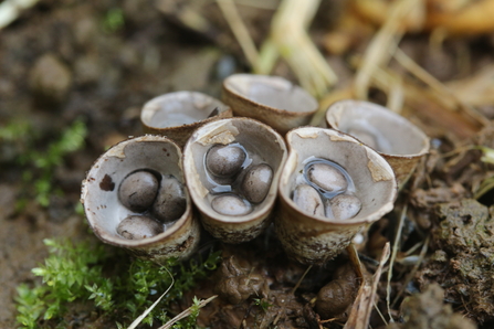 Identifying what a fungus is growing on can help narrow down possibilities. Though sometimes it’s hard to tell whether the mycelium is feeding on moss, a buried twig, or the surrounding soil. But with practice you’ll discover bird’s nest fungi (Nidulariaceae) often appear on woodchip, while wood ear fungi (Auricularia auricula-judae) grow mainly on elder trees.