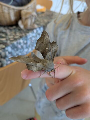 A photo of a poplar hawkmoth on a child's finger