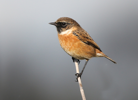 A small, dumpy chat, the stonechat is a little smaller than a robin. It has a big head and short tail. It can frequently be seen sitting on the top of gorse bushes, flicking its wings and making a call like two small stones being hit together. Stonechats inhabit heaths, bogs and conifer plantations. They eat invertebrates, seeds and fruit, such as blackberries.How to identify