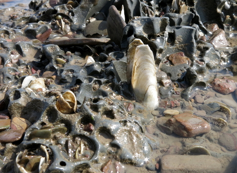 Piddocks are a strange group of clam-like shellfish that burrow into soft rocks such as clay and sandstone. They begin this process after settling as larvae and slowly enlarge and deepen the burrow as they grow. As such, they are essentially locked in and will live there for the rest of their lives. From the protection of their burrows they extend their siphon outwards to filter feed on organic matter from the water column. When the piddock dies, the empty burrows provide an additional habitat and refuge for other marine species, including other molluscs, juvenile crabs and even small sea anemones. Their long oval shells are distinctively wing shaped, giving piddocks their other common name of Angelwings.