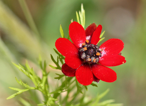 The beautiful, wine-red flowers of Pheasant's-eye have black, poppy-like centres and delicate, feathered leaf segments.